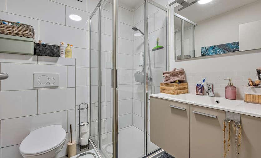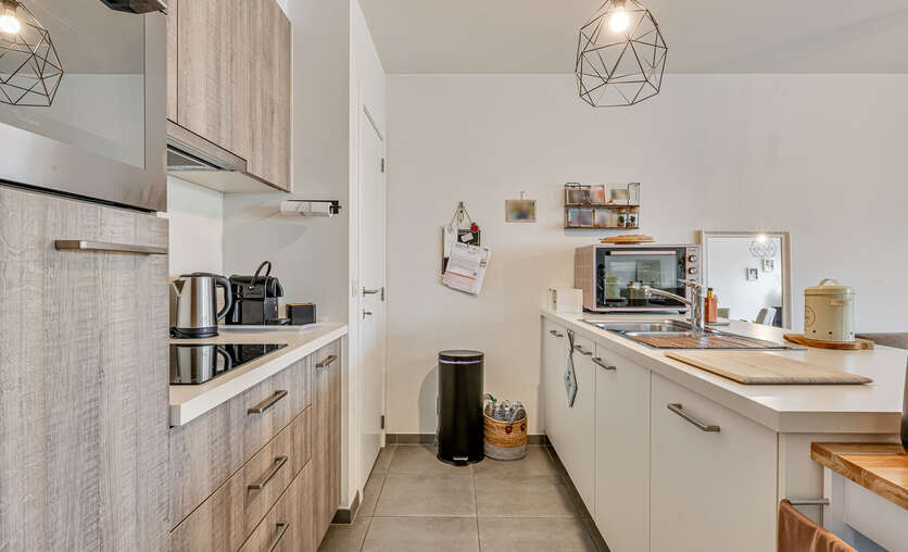 Het appartement bevat 1 slaapkamer, een lichtrijke leefruimte, een geïnstalleerde keuken, badkamer met wastafel en douche, een berging, afzonderlijk toilet en een ruim terras achteraan.