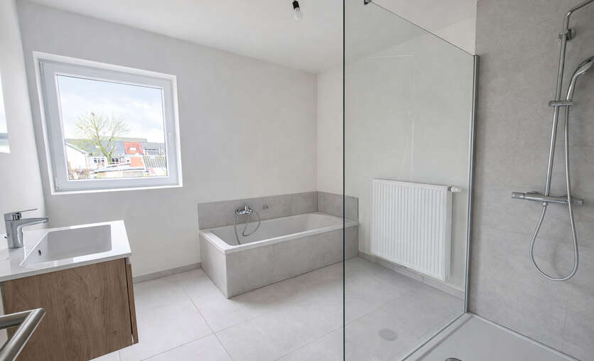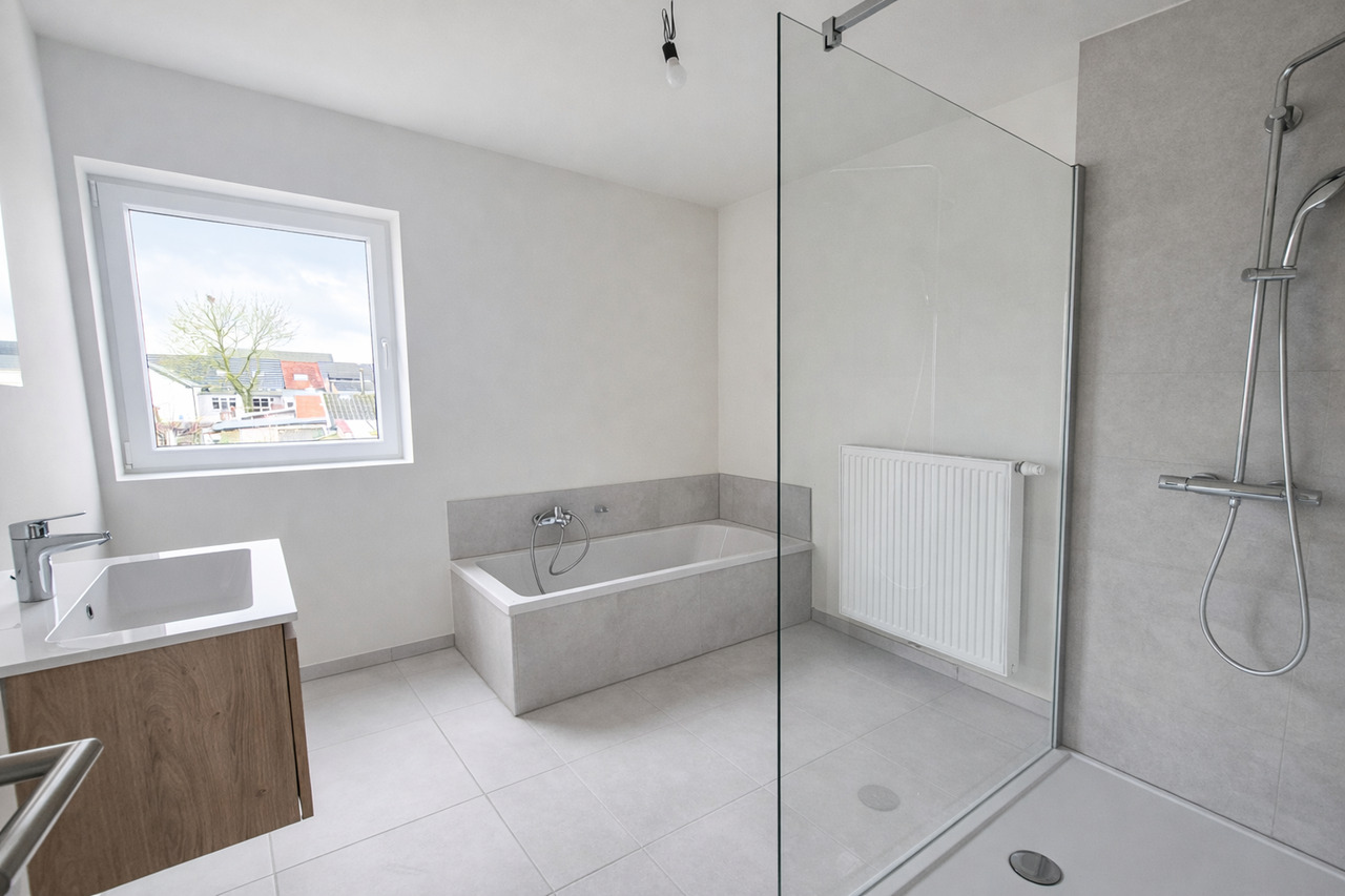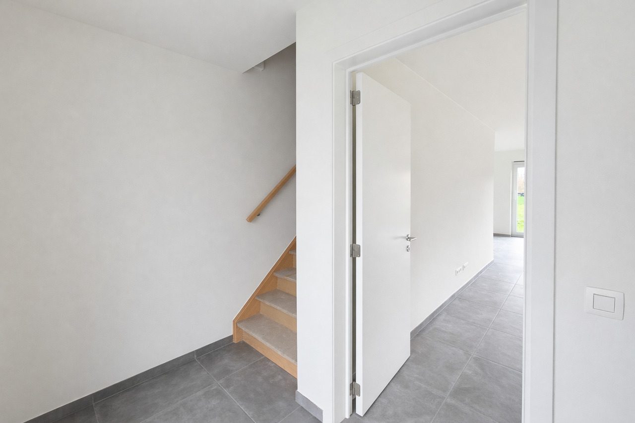 Op de verdieping bevinden zich drie ruime slaapkamers, ideaal voor gezinnen, thuiswerkers of wie graag een hobbykamer voorziet. De badkamer is logisch ingedeeld en biedt alle hedendaagse voorzieningen, terwijl een afzonderlijk toilet extra comfort garandeert. De nachthal verbindt alle ruimtes op een rustige en overzichtelijke manier.