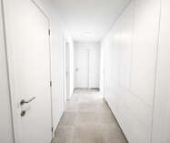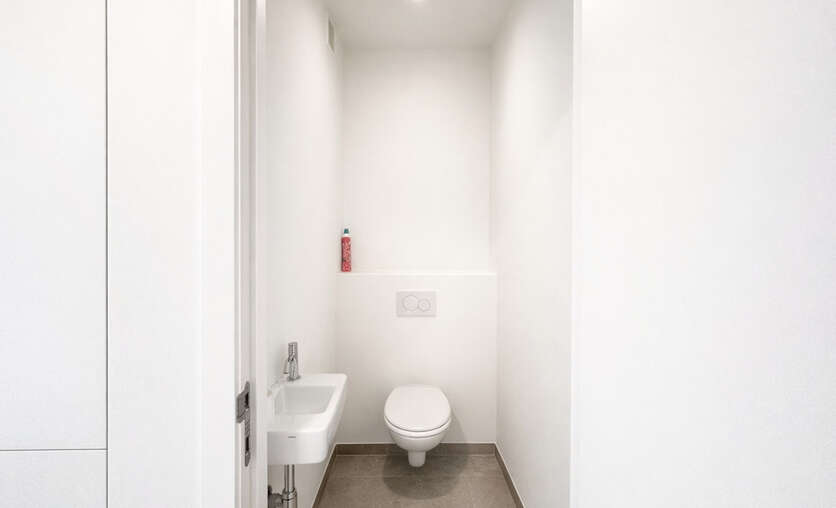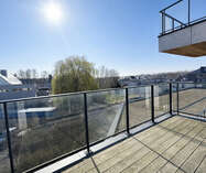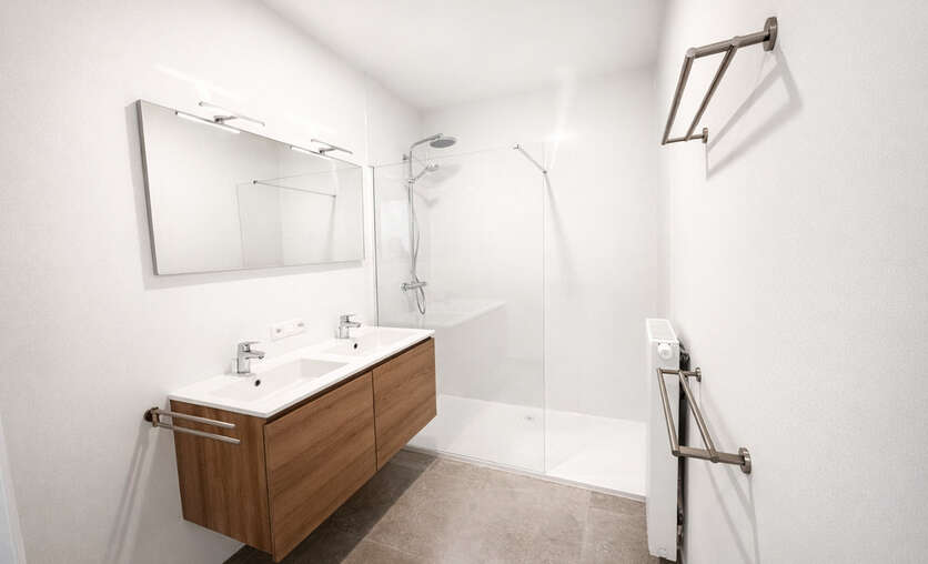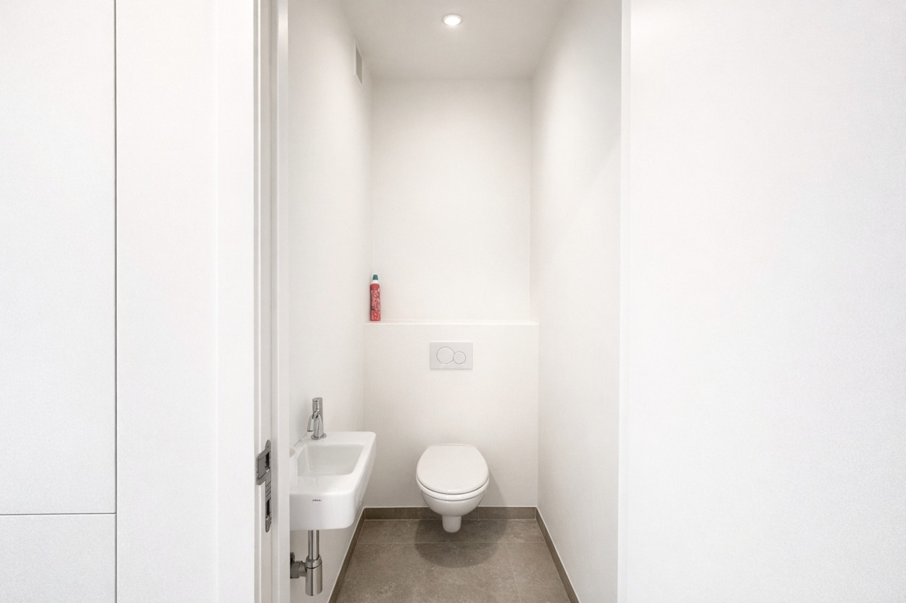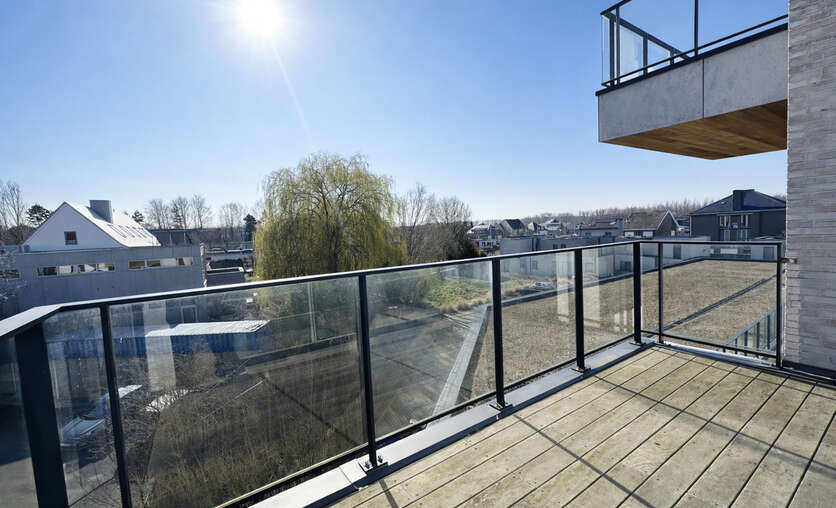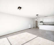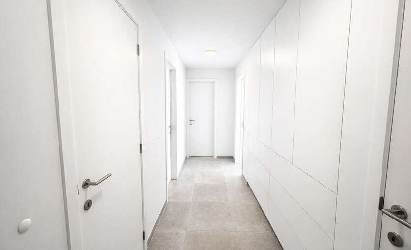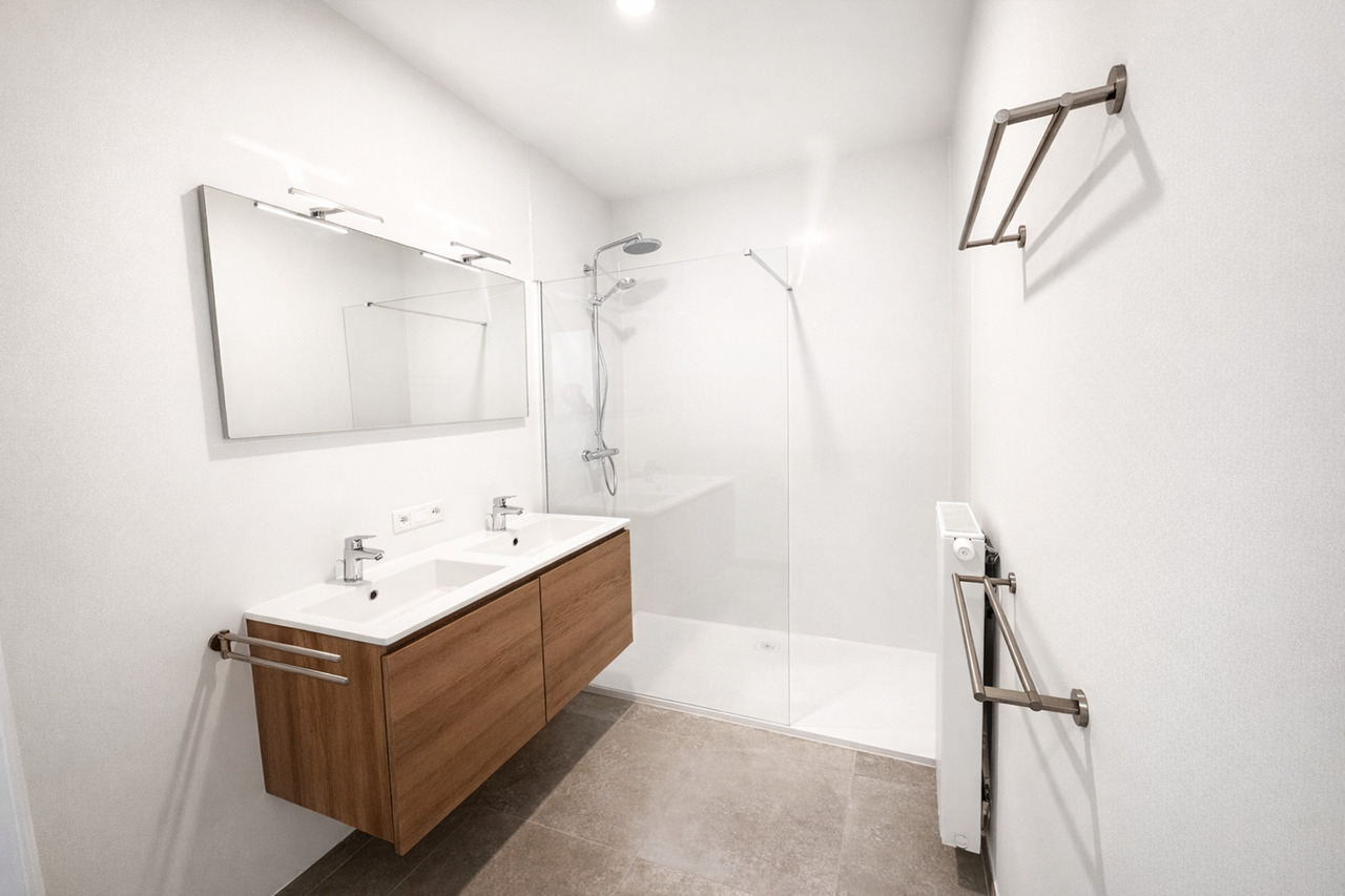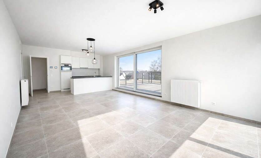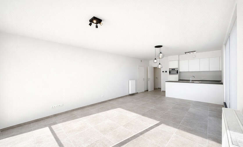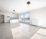 Bij het binnenkomen kom je in een centrale inkomhal die toegang geeft tot een apart gastentoilet, de leefruimte, de 2 slaapkamers en de badkamer. De ruime leefruimte met eetplaats vormt het hart van het appartement en sluit naadloos aan op de open keuken. Deze leefruimte biedt veel natuurlijke lichtinval en geeft rechtstreeks uit op 2 grote, zonnige terrassen — ideaal om te ontspannen of gezellig buiten te eten.
