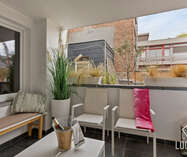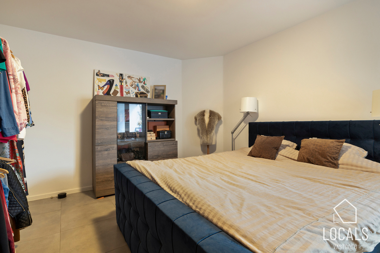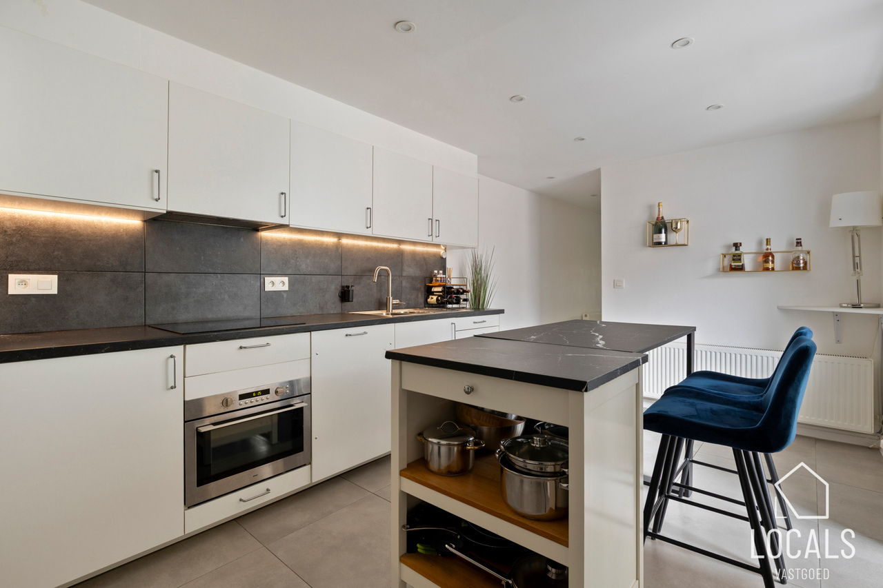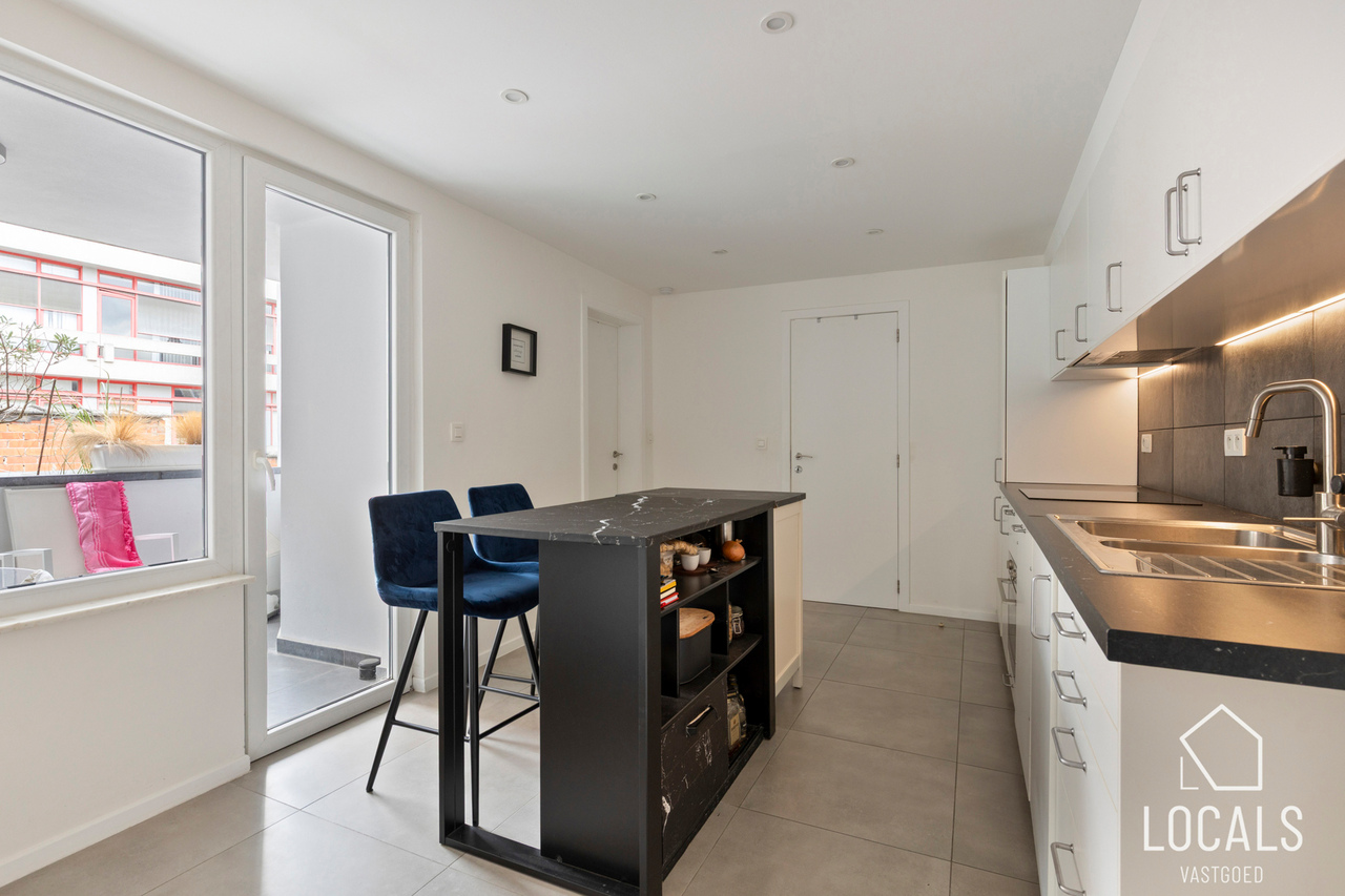 Het appartement zelf bevindt zich op de eerste verdieping en verwelkomt u met een gezellige leefruimte met eetplaats, waar licht en ruimte harmonieus samenkomen. De open keuken is uitgerust met alle courante toestellen en sluit naadloos aan op een praktische berging/wasplaats. De ruime master bedroom van maar liefst 16m² biedt volop comfort, terwijl de moderne badkamer is ingericht met een stijlvolle inloopdouche en kwaliteitsvolle afwerking. Op zonnige dagen vormt het aangename terras een heerlijke plek om te genieten van rust en privacy midden in de stad.