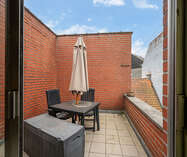 Aan de keuken bevindt zich een doorloop naar het andere gedeelte van het appartement. Hier is een tweede leefruimte aanwezig, met berging (alsook douche aanwezig) en een derde slaapkamer. Verder is hier ook een ruim terras aanwezig.
