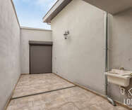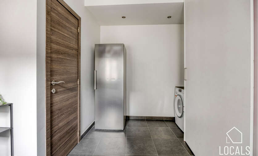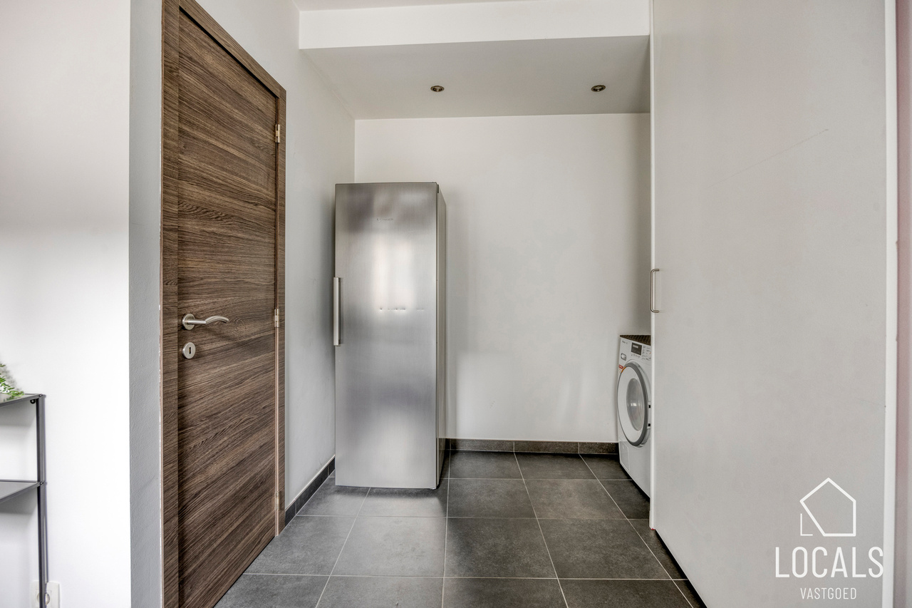 Het gelijkvloers verwelkomt je met een ruime en lichtrijke leefruimte die naadloos aansluit op de stijlvolle open keuken. Daarnaast vind je er een praktische berging met maatkasten die ook dienstdoet als wasplaats, een gastentoilet en de toegang tot de droge kelder die ideaal is als extra bergruimte. Via de tussenhal kom je uit op het aangename terras, volledig afsluitbaar met een elektrische poort.