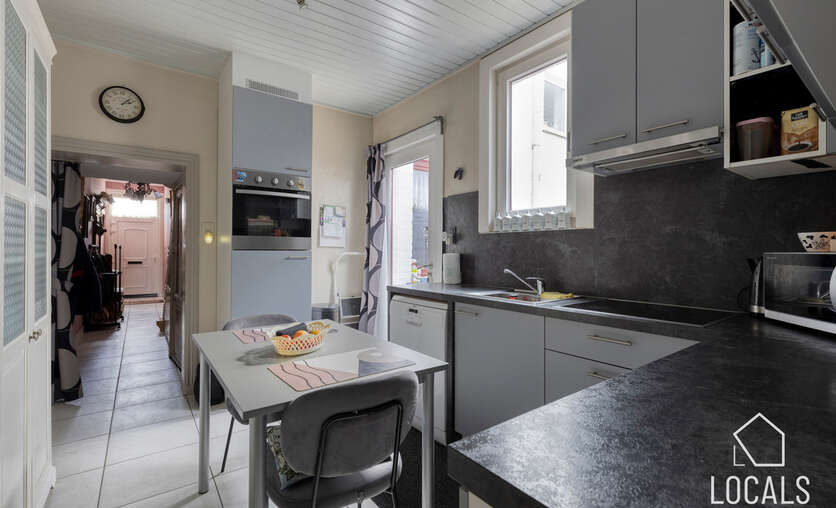 Bij het betreden van de woning kom je binnen in de inkomhal die toegang biedt tot de lichtrijke leefruimte. Aansluitend bevindt zich de geïnstalleerde keuken, uitgerust met een vaatwasser, oven en inductiekookplaat. Verder vinden we op het gelijkvloers een apart toilet, een praktische badkamer met douchebad, en een handige bergplaats met aansluiting voor een wasmachine.