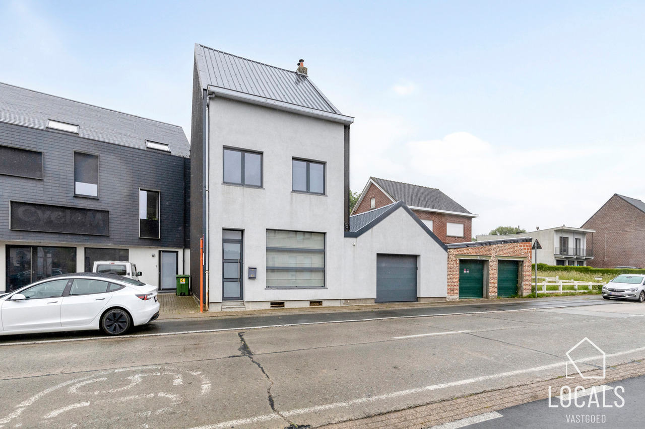 De indeling is als volgt: lichtrijke inkomhal, een ruime leefruimte met aansluitend een moderne open keuken (volledig geïnstalleerd en voorzien van een oven, microgolfoven, kookplaat, spoelbak en vaatwas), grote berging en zeer ruime garage. Aansluitend op de woning vinden we de leuke tuin. Kelder aanwezig.