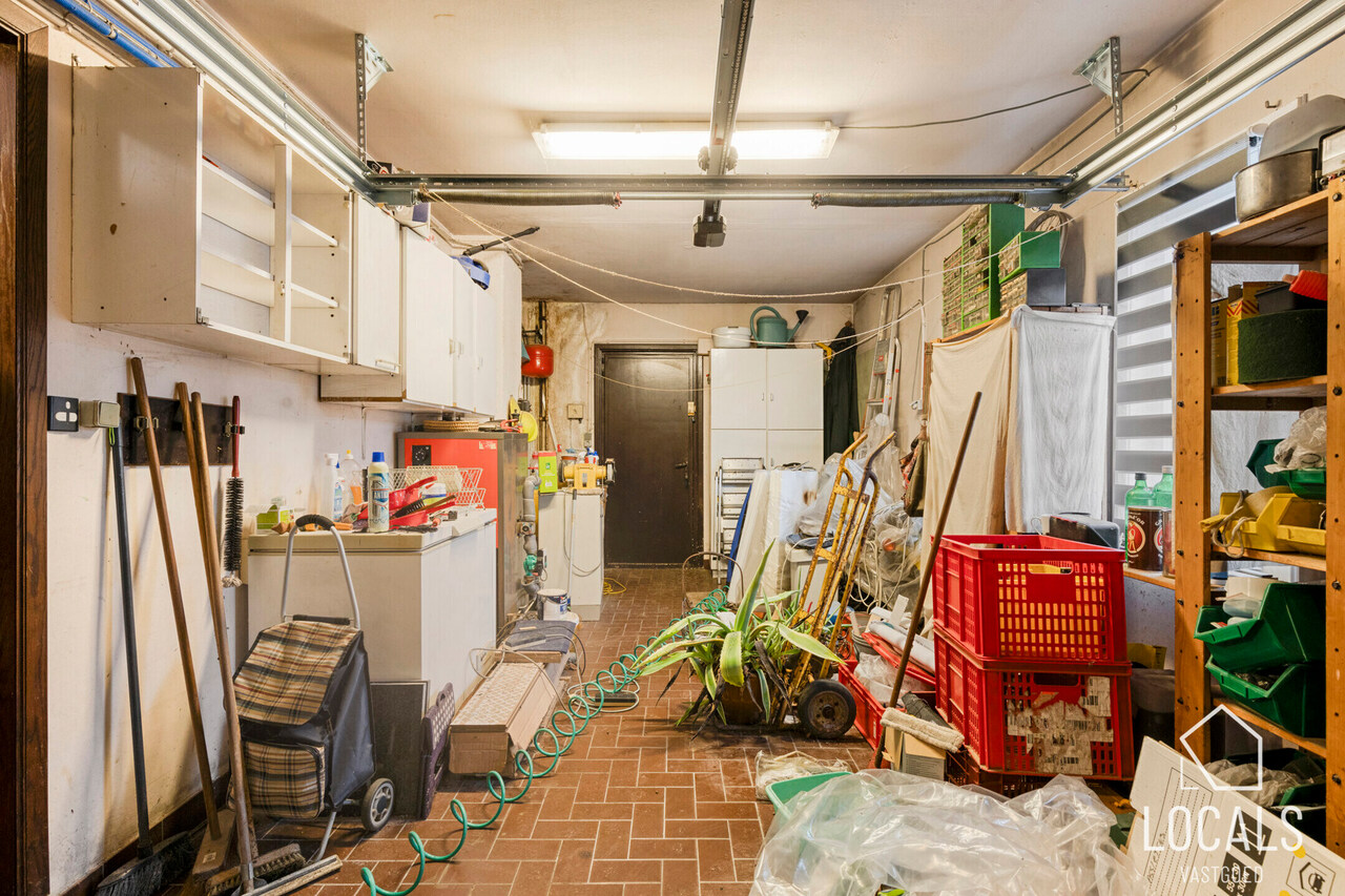 Het gelijkvloers omvat een inkomhal met apart toilet, een ruime leefruimte met salon en eetplaats met zicht op de tuin, een leefkeuken, berging en een garage.