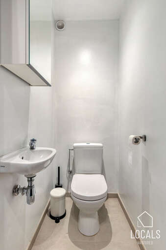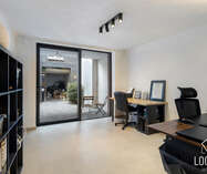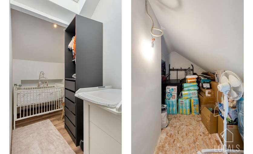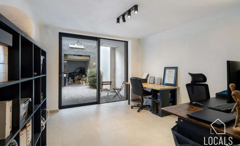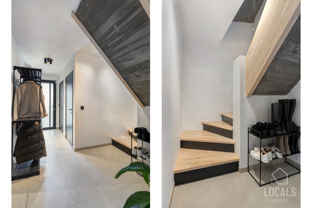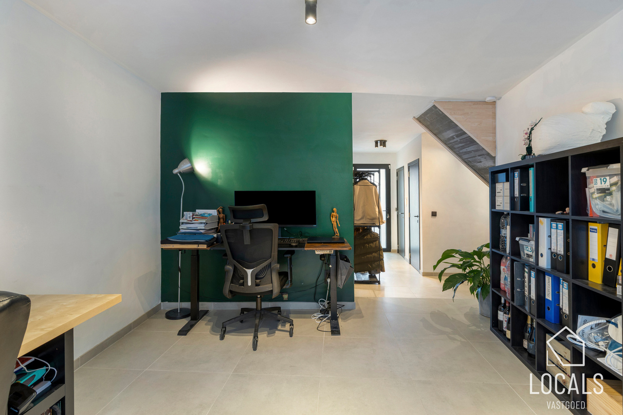 Bij het betreden van de woning komt u binnen in een verzorgde inkomhal met een apart gastentoilet en een praktische berging. Op het gelijkvloers bevindt zich een polyvalente ruimte die perfect kan dienen als bureau, praktijkruimte of extra slaapkamer. Aansluitend is er een eerste buitenruimte met een ruime buitenberging. Op de eerste verdieping bevindt zich de gezellige leefruimte met aansluitend de prachtige volledig uitgeruste keuken met kookeiland. Deze verdieping geeft ook uit op een tweede terras. De tweede verdieping herbergt de masterbedroom, een stijlvolle badkamer met inloopdouche/tweede toilet en lavabo, evenals een extra bureauruimte of babykamer. Via een uitklapbare trap is de zolder bereikbaar die perfect kan dienen als stockageruimte.