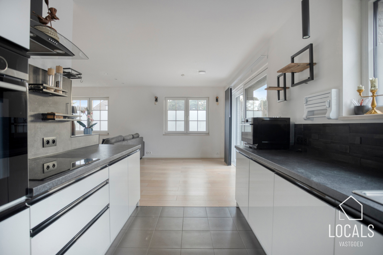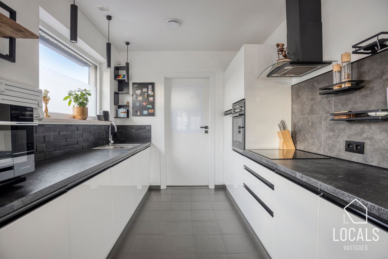 Op het gelijkvloers bevindt zich een gezellige inkomhal met directe toegang tot de ruime garage met automatische poort. Verder is er een lichtrijke leefruimte met grote raampartijen en een halfopen keuken met kwalitatieve toestellen. Een aparte berging zorgt voor extra opbergruimte.